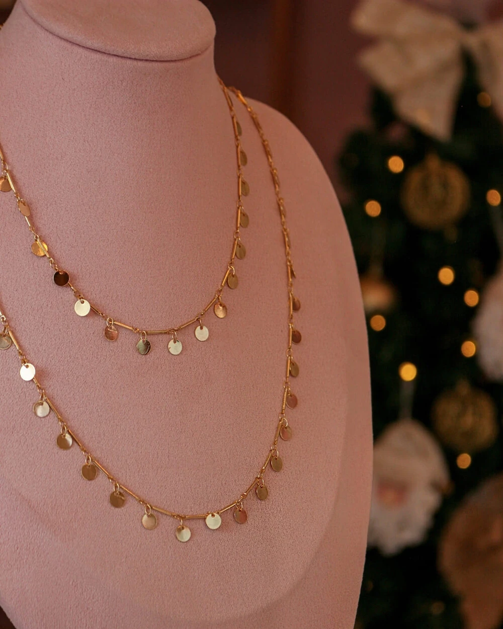 O choker fica mais rente ao pescoço, trazendo um efeito iluminado com suas mini medalhas polidas que refletem a luz de forma delicada.