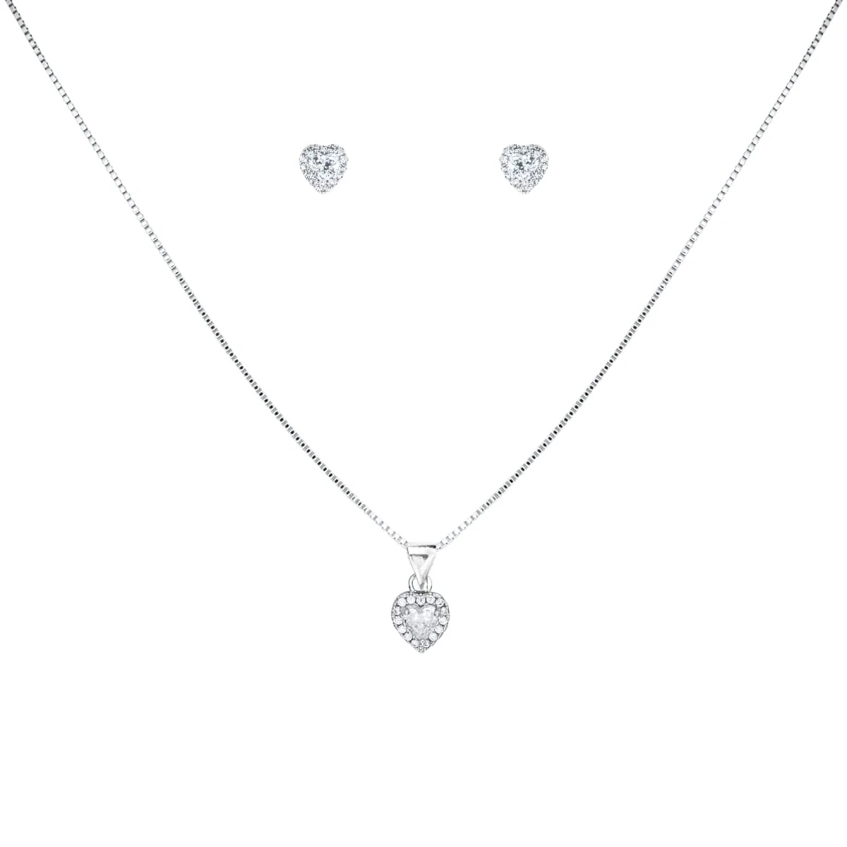 Composto por um colar e brincos que exibem um pequeno pingente em formato de coração, esse conjunto irradia brilho e charme.
