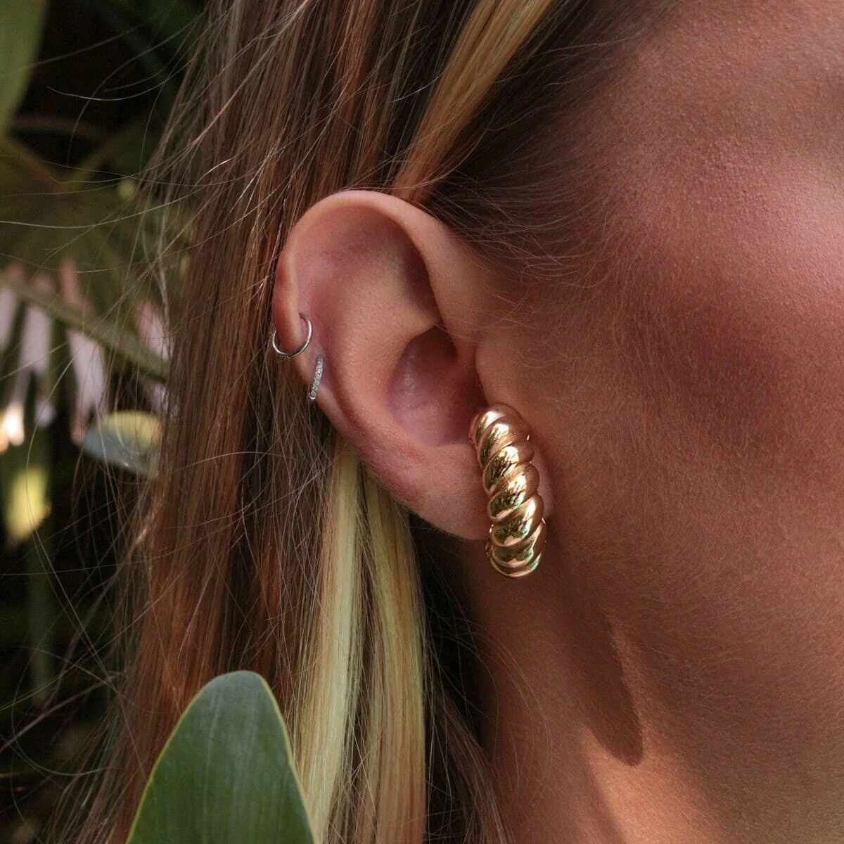 Sofisticação com um toque ousado. O nosso Brinco de Encaixe Maxi Torcido une o charme do acabamento torcido estilo croissant com a modernidade de uma base geométrica e vazada que remete a teias entrelaçadas. Se adapta com perfeição à orelha, sem exigir furos. Para quem ama brincar com a estética urbana, esse brinco é um must-have no porta-joias. Conforto, impacto visual e praticidade num só acessório. Encaixou? Pronto! Já está pronta para sair.