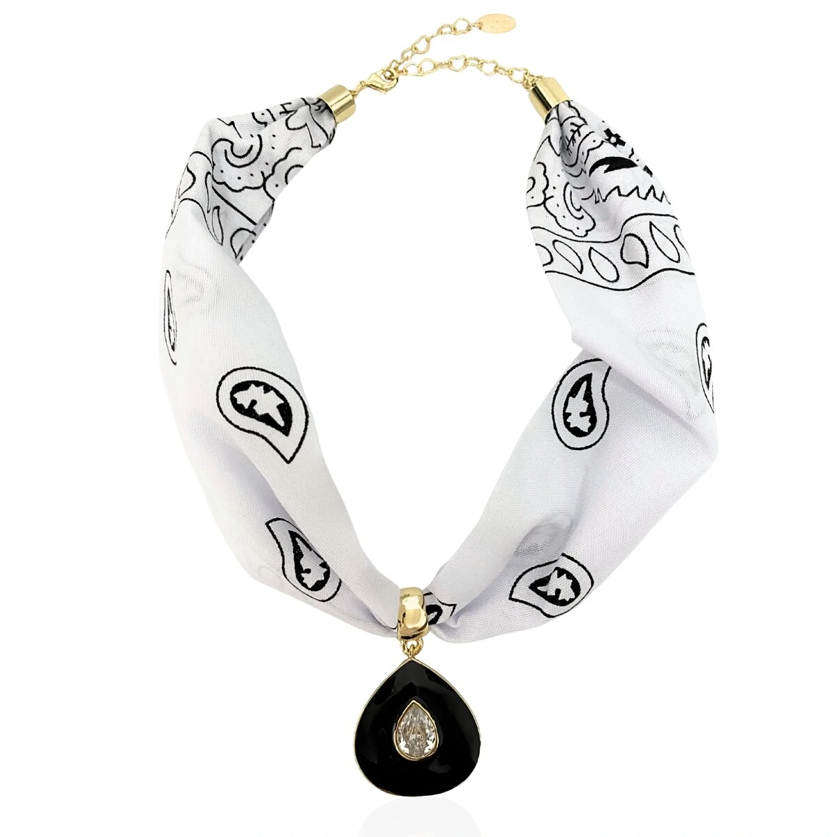 O tecido branco contrasta com o pingente preto esmaltado, que abriga uma zircônia em forma de gota, criando um ponto focal de elegância.