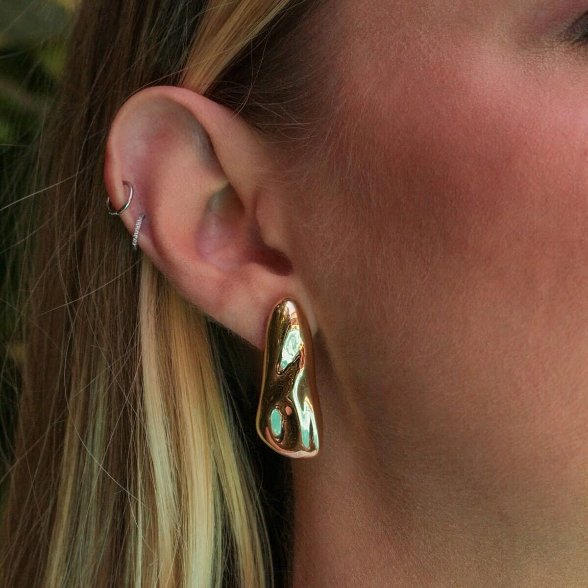 Estilo contemporâneo com naturalidade; o Brinco Médio Orgânico Pontudo é um acessório feminino com design arredondado, acabamento liso e textura levemente amassada, transmitindo autenticidade.