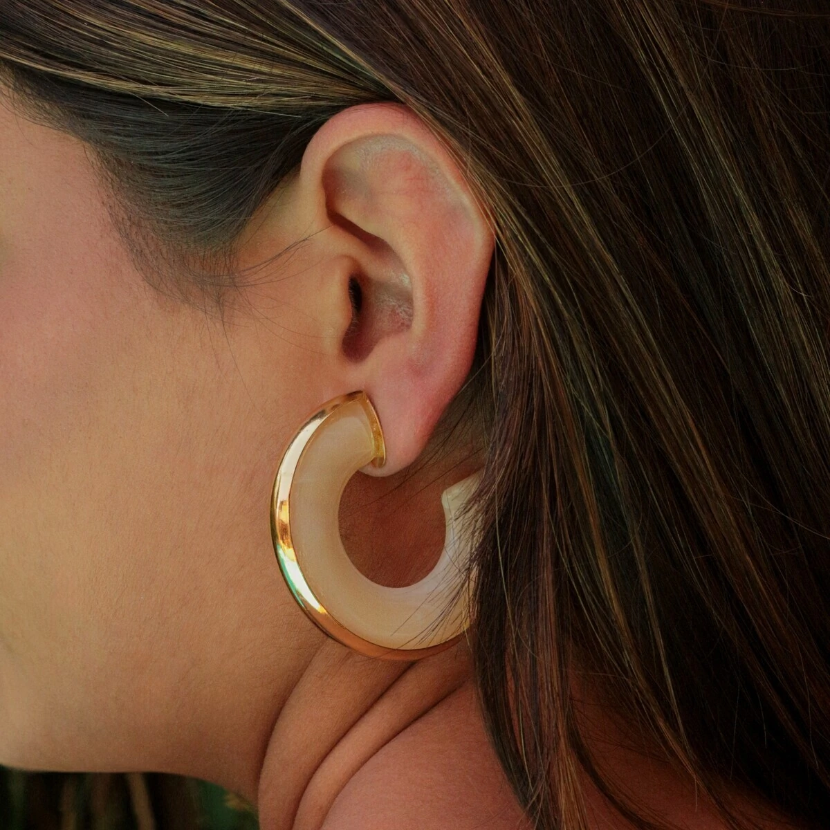O detalhe que transforma seu visual; a Argola Meio Lado Resina Creme é um brinco moderno que combina robustez e suavidade em um design dividido entre metal polido e resina em tom creme.