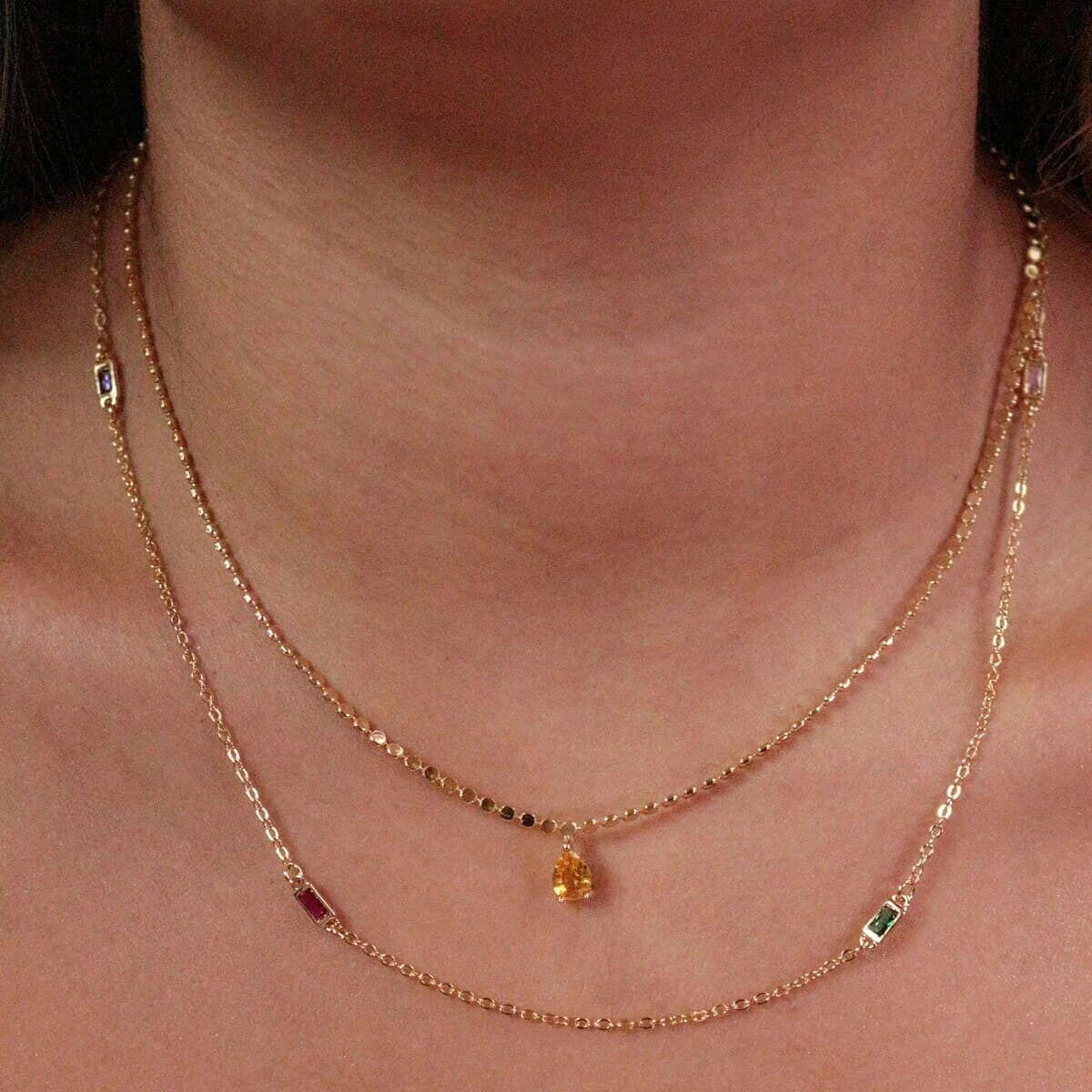Sua corrente de pequenas bolinhas chapadas soldadas cria brilho sutil, enquanto o pingente em formato de gota com pedra citrino adiciona luminosidade e significado ao look.