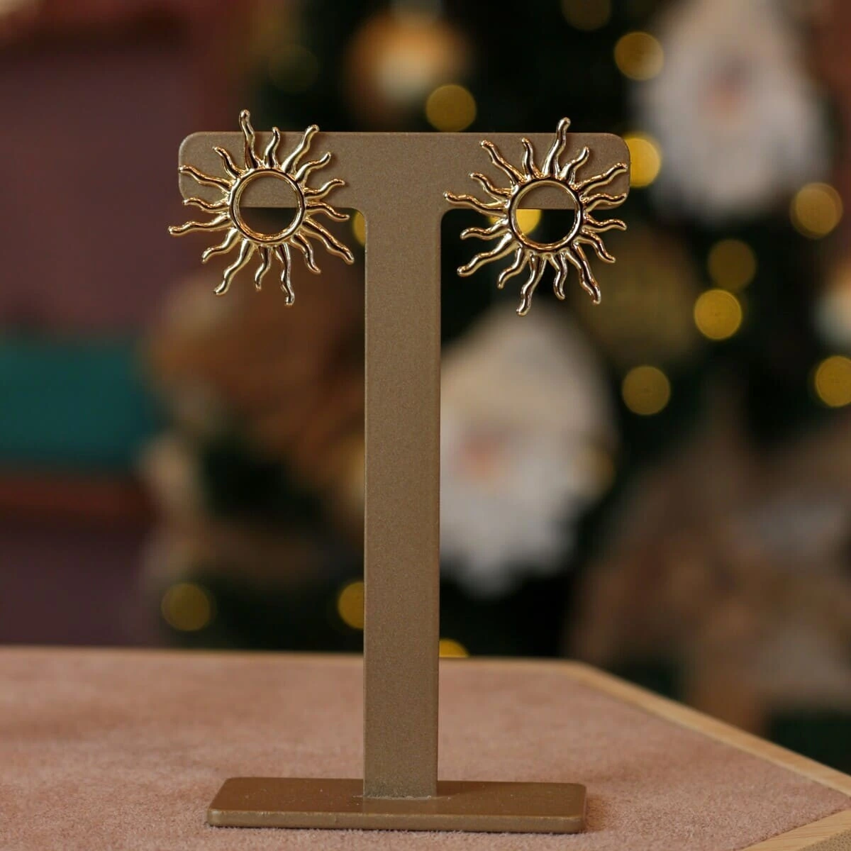 O Brinco Médio Sol entrega exatamente essa sensação: um design orgânico com 16 raios ondulados e assimétricos que criam movimento e brilho a cada movimento do rosto.