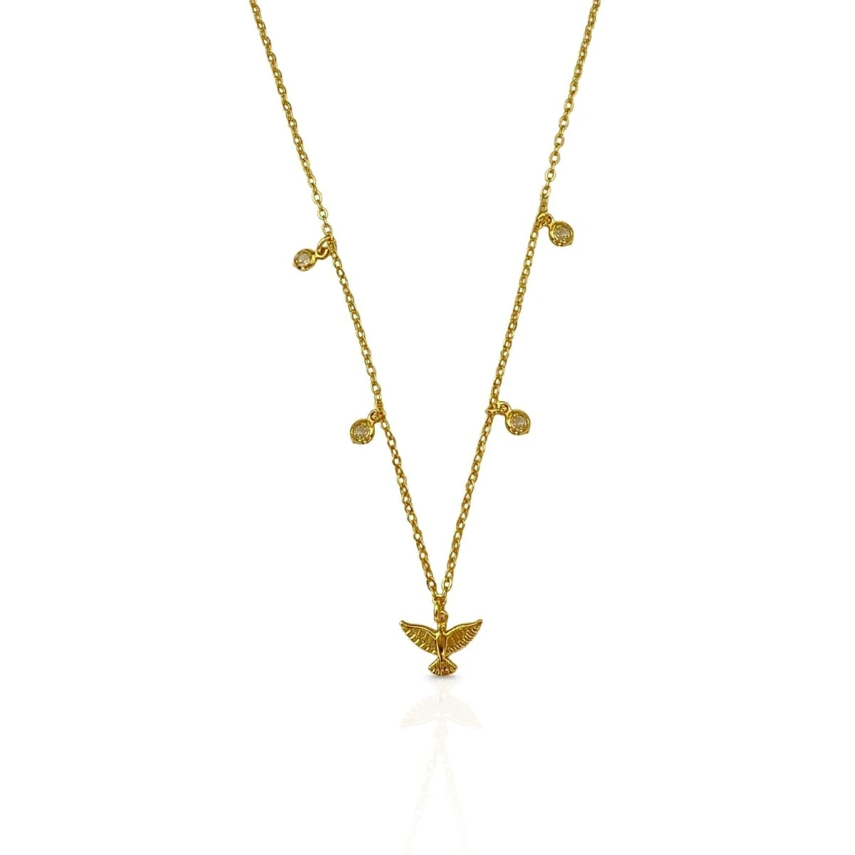 Com quatro pontos de luz delicados e um pingente de Espírito Santo de asas abertas, ele ilumina o look e carrega significado ao mesmo tempo.