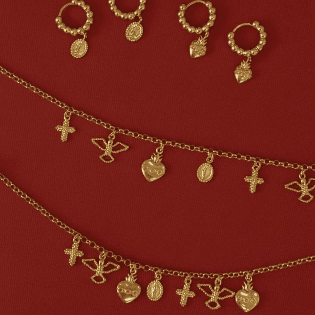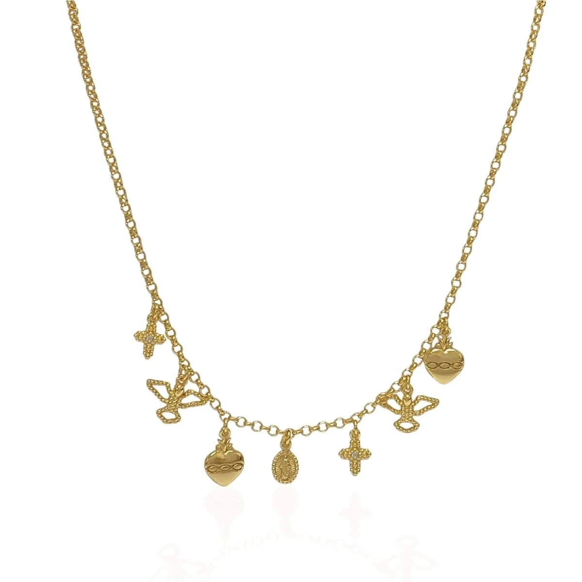 A corrente clássica recebe sete pingentes delicados Sagrado Coração, Espírito Santo, crucifixo, Nossa Senhora e outros símbolos que carregam fé e propósito.