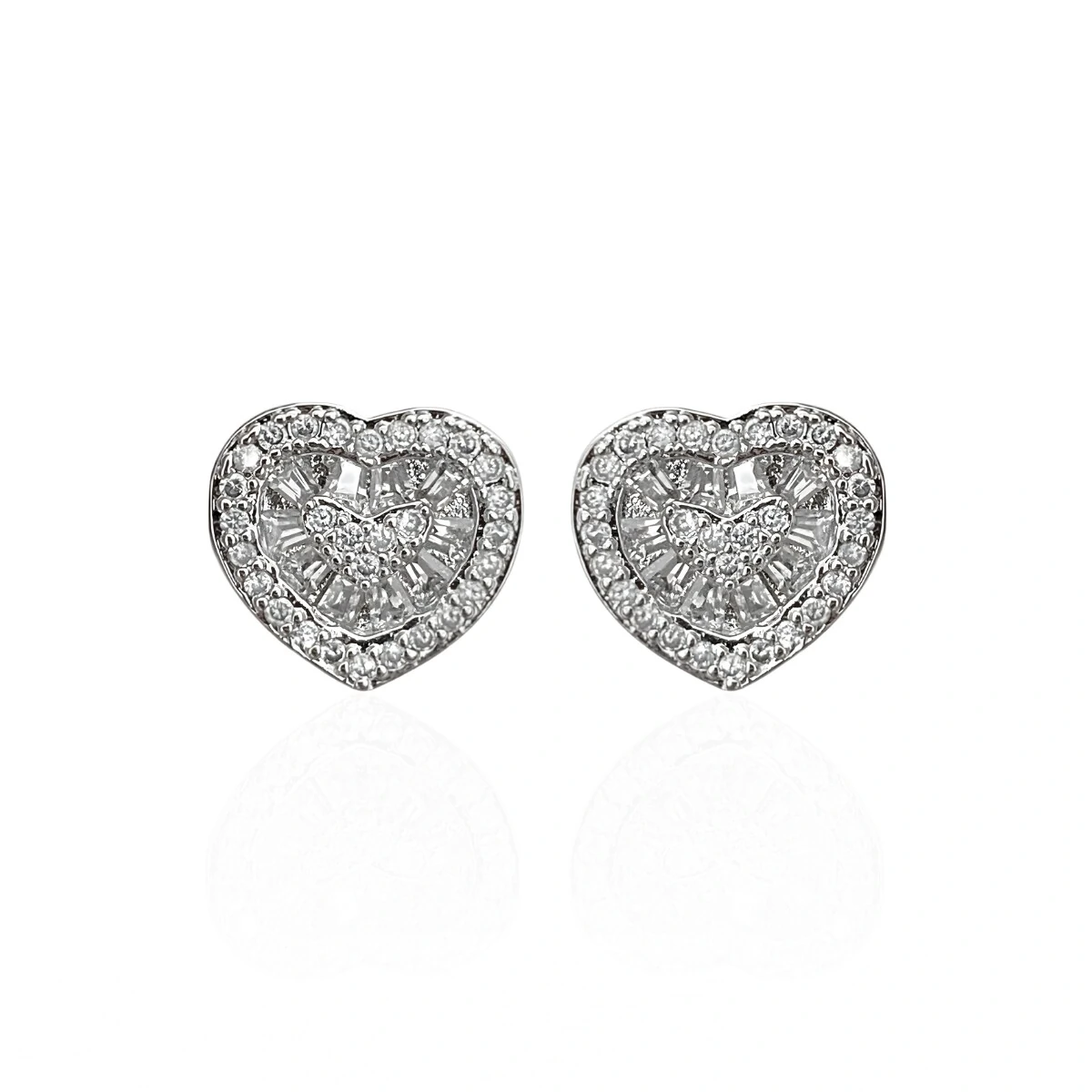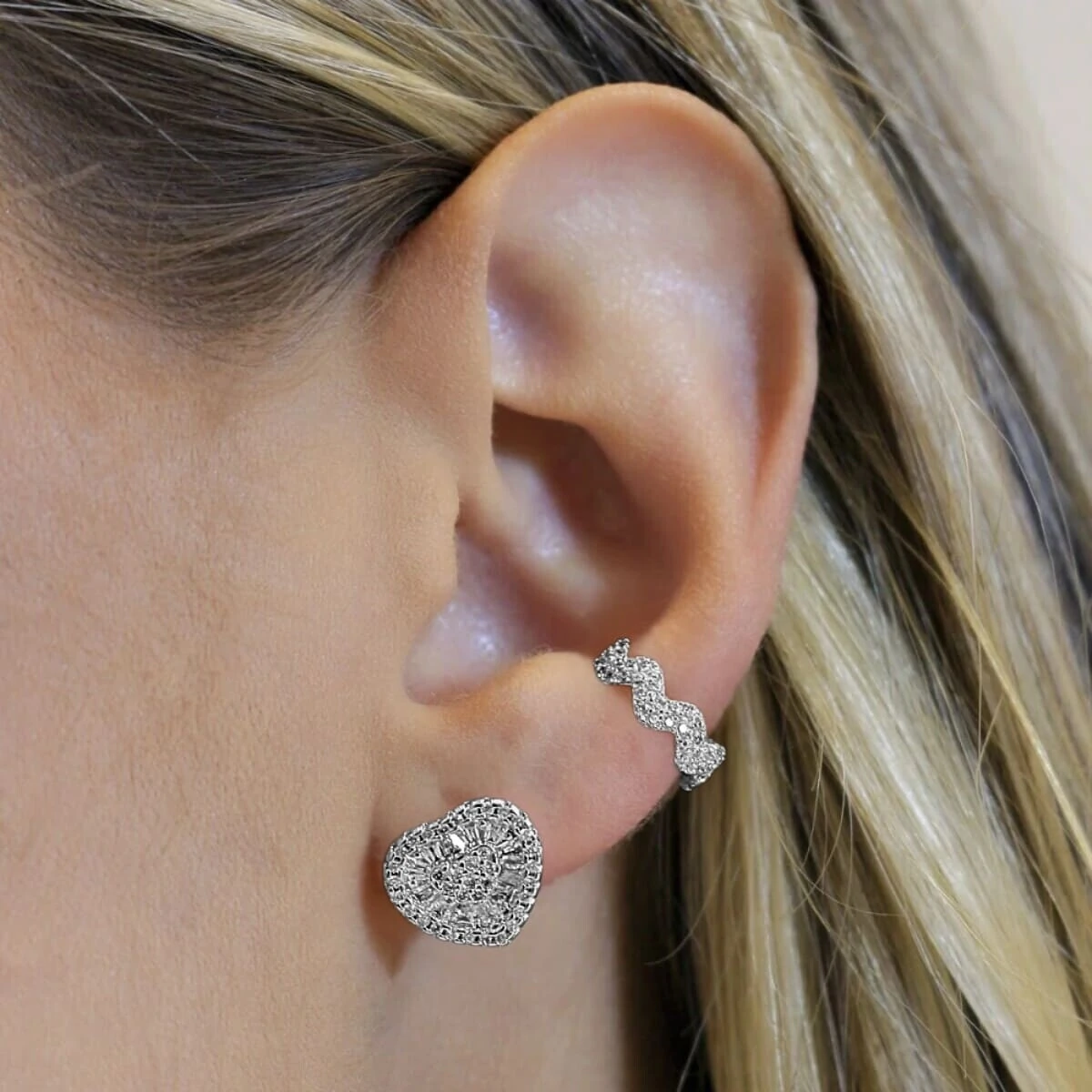 Esse par de brincos, de tamanho médio, apresenta um mini coração cravejado em seu centro, rodeado por pedras em formato baguete que adicionam ainda mais brilho e elegância.