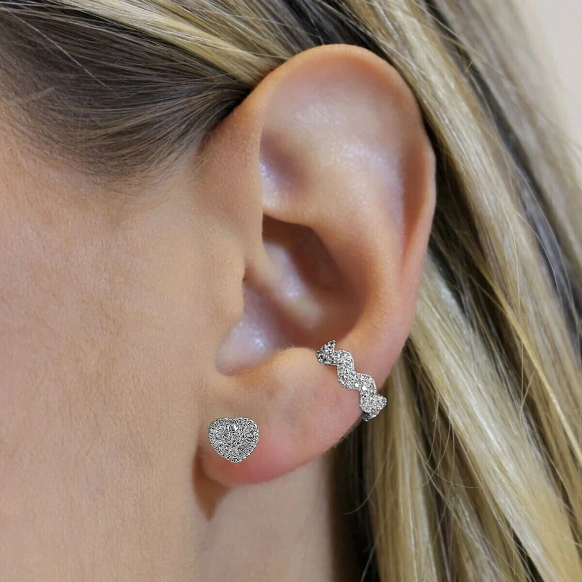 Esse par de brincos, de tamanho médio, apresenta um mini coração cravejado em seu centro, rodeado por pedras em formato baguete que adicionam ainda mais brilho e elegância.